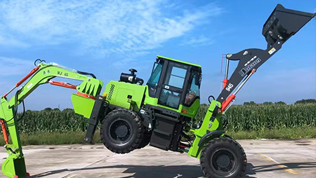 連接復合動作一拖二操作手柄,簡介易操作由于它具有共同的結構,前端是裝載設備,后端為發掘設備。在施工時,操作手只需求翻滾一下座椅,就可以結束從裝載機到發掘機的改動
